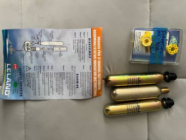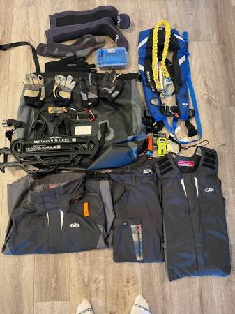 For Sale - Sailboat racing foul weather gear and personal safety gear for Mackinac Race requirements. Due to medical reasons I can no longer be on the water. I typically drive/helm - so, nothing has gotten much wear LOL. I bought everything about 5 years ago and have not sailed in the last 2 years. The foul weather gear is a size large, and the day pants are a size 34 - maybe worn 10 times. The waterproof socks are for a male size 12 - maybe worn 5 times. I am 6' tall and was 210 pounds when I purchased everything - everything fits just as well with me now being 170 pounds. All CO2 cannisters and bobbins will be out of date by this fall, but would be great for pool practice. All items pictured are included. $575.00 firm or I will keep everything for recreational purposes.