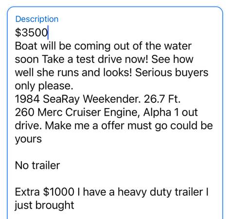 Boat will be coming out of the water soon Take a test drive now! See how well she runs and looks! Serious buyers only please.