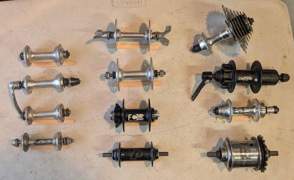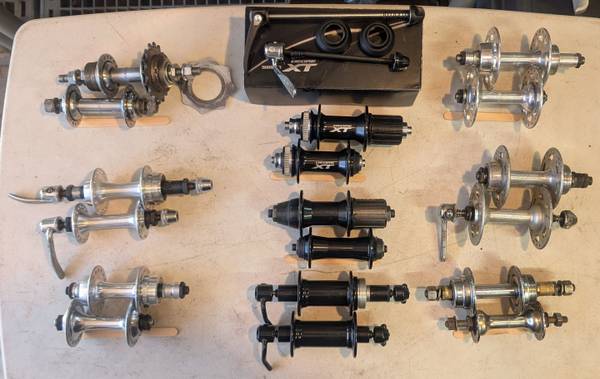 Descriptions are from the top of the pics toward the bottom and left to right. OLD measurements are reasonably accurate. For those QR hubs that don't include a skewer, I may have an unmatched skewer that will fit.