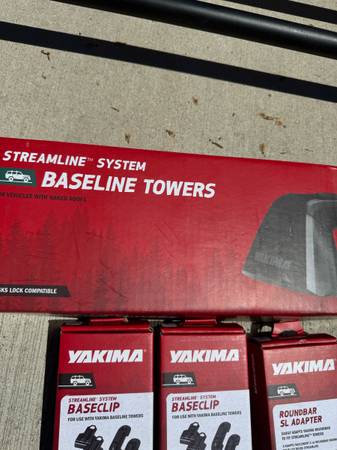 Yakima Medium 58” Round Bar Pair Yakima Railgrab Towers (4 pack) Yakima Baseline Towers (4 pack) Yakima BaseClips BC102 (2 pack) Yakima BaseClips BC110 (2 pack) Yakima Roundbar SL Adapter (set of 4)...