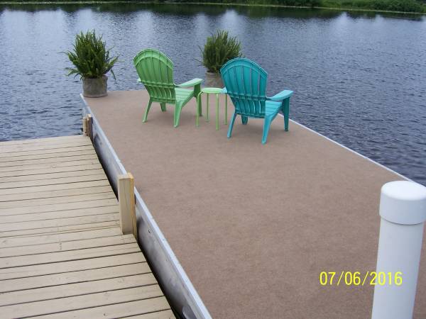 This large floating dock is 24' x 8‘ and the deck is a true 22’ long and 8’ wide. The all-season carpet is new and fast-drying. The floor is new 3/4” marine plywood laid over and fastened to original 3/4" marine plywood with stainless steel fasteners.