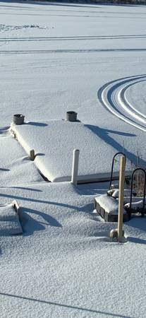 This dock never has to be taken out of the water in the winter. It is light enough to sit in the water and formed ice with no damage to the pontoons. You can safely fish/ice fish off any portion of this dock year-round.