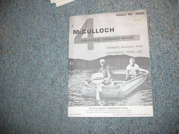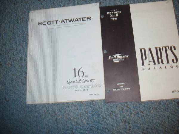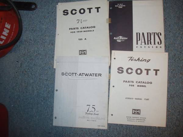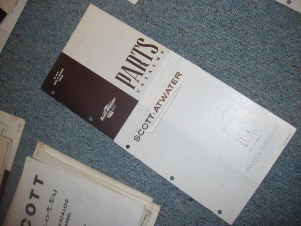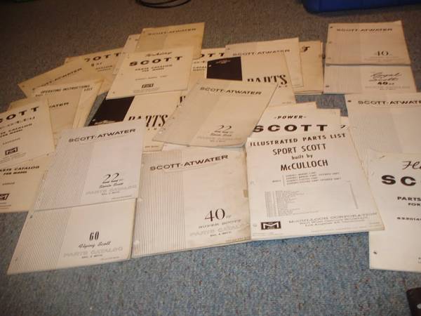 invaluable when you need to know the part & part number when searching the internet & ebay--I find them better than a service manual-SCOTT ATWATER started making outboards under their own name in 1946---by about 1956 they were bought out by the big 2 cycle power tool company McCulloch-for a few years they were SCOTT & then slowly became McCULLOCH different names but basically the same outboards -McCulloch tried to sell the company but there were no takers-McCulloch closed down in 1969-$2 EACH---2 for $3 ----5 for $7--10 for $12 --$20 for $20