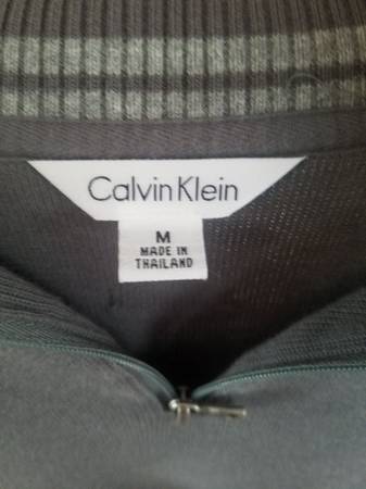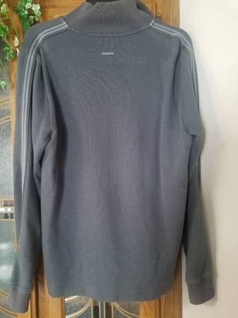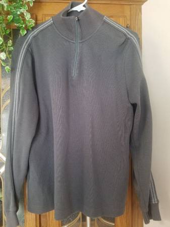 Gray w/pinstripes down sleeves Size - Medium Ribbed stand collar Front half-zip placket Long sleeves with ribbed cuffs Very good condition