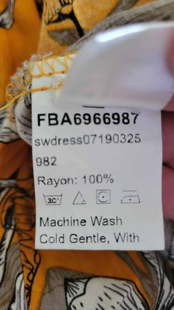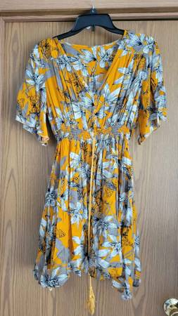 Shorter almost knee length gray, white and orange-yellow dress with corded tie and elasticized waist. $15