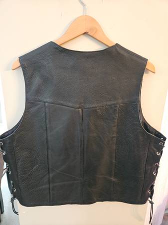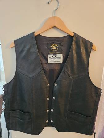 Men's Leather Motorcycle Vest. Size is 44. Vest has snap front and a pocket on the inside. Vest is in excellent condition. Asking $35 cash only.