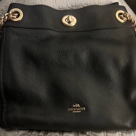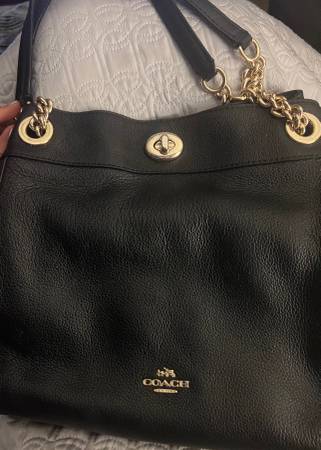 Coach Ladies Shoulder Bag. Size: L13" 1/2 x H 10 3/4 "× W 5 1/2". Coach Ladies Dalton 31 Black Pebble Leather Shoulder Bag. Dalton 31 shoulder bag is crafted from pebble leather featuring a snap closure, fabric lining, 2 interior compartments, a center zip compartment, handles with 9 3/4" drop and interior zip. Small tear in lining as shown in photo.