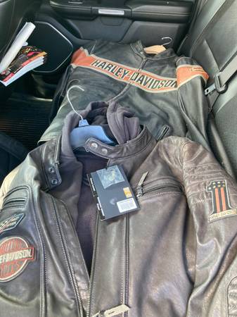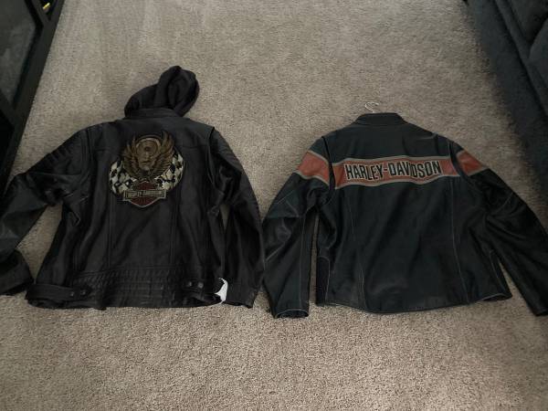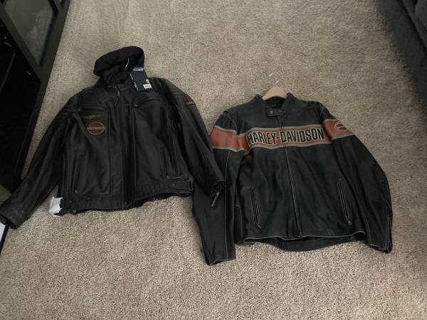 2 leather jackets, 1 with hoodie 2x one brand new, one in mint condition