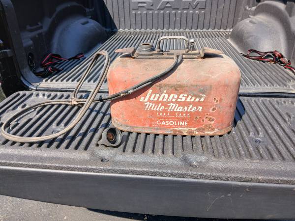 This product is a Vintage Johnson Mile-Master 6 gallon gas tank designed for outboard engines. It has two lines for fuel intake and is suitable for boats. A must-have for collectors of advertising memorabilia. It's a unique piece of history that is sure to impress any collector. Vintage. Very rare in this condition. Cash only upon pickup.