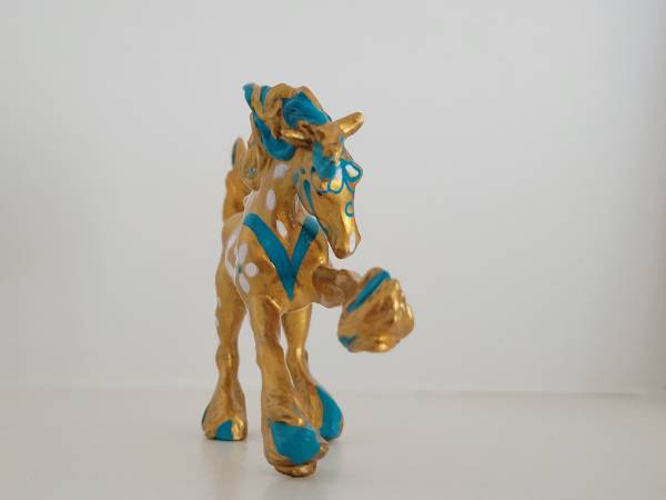 Breyer Model Horse customized by Kristen Cermele. Done in gold with white flowers and turquoise accents. The astrological symbol for Aries is on its chest and back. This model is Stablemates scale,...