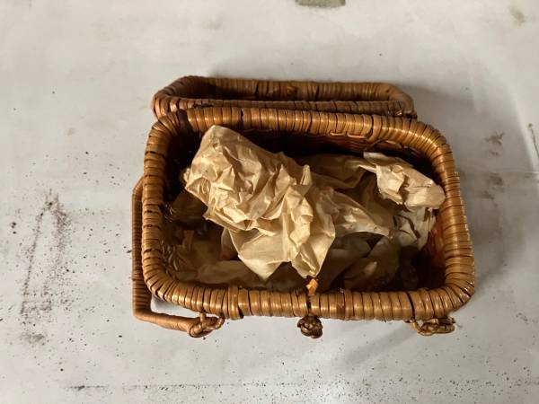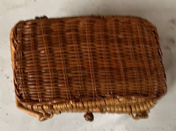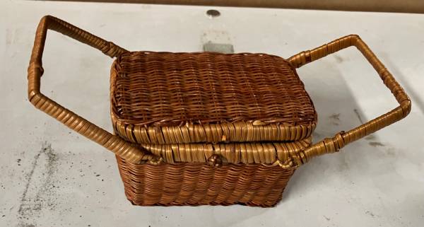 Vintage Mini Wicker Picnic basket , 4 1/2" tall x 6 1/4" long x 4 1/2" deep .