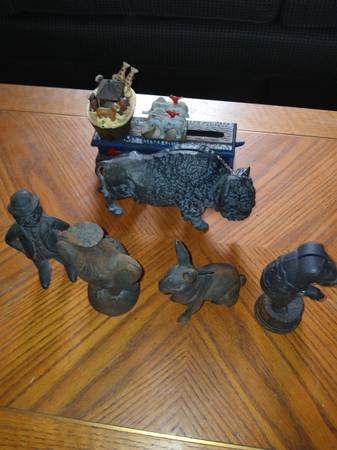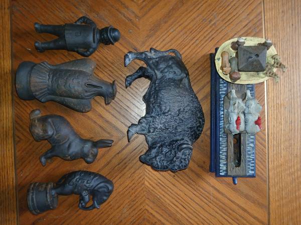 Cast iron coin banks..the bison is signed art smithy on inside..the ark is tagged bits and pieces brand but is missing bird from roof top...all in uncleaned condition..$50 for the 6 total..