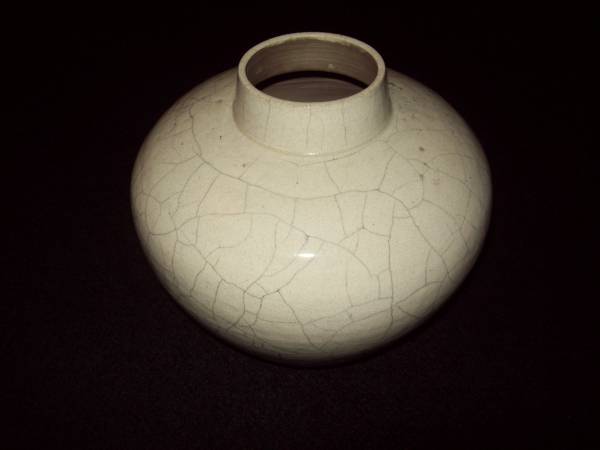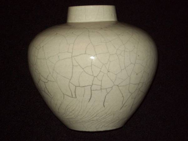 Jay Gogin Crackled Vase, signed & dated 1983 - cream w/black accents Dimensions: 10"dia x 9 1/2"high, opening is 3 1/4"dia In fine condition. Cash only.