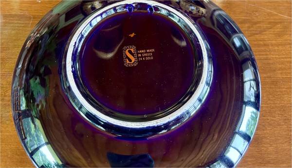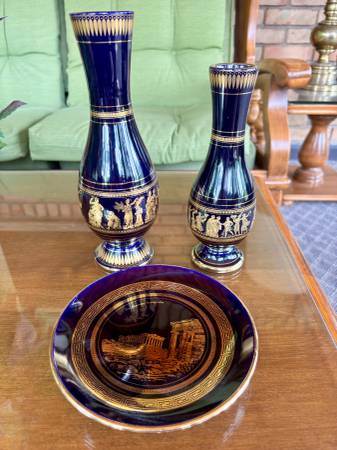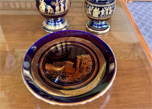 Vintage vases and Parthenon plate crafted by I. Spyropoulos. Dark blue ceramic with 24K gold trim. All handmade and purchased in Greece. In excellent condition.