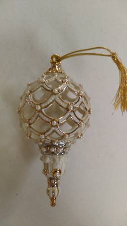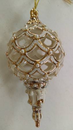Vintage Lenox Florentine & Pearls Spire Ornament Ivory lattice design with faux pearls and gold trim Dimensions: 3"dia x 6"h In fine condition Cash only