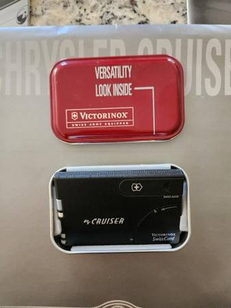 Original 2000 Chrysler PT Cruiser Swiss Army Knife Card Victorinox Promotional Box Set. Includes Swiss Army Victorinox Knife/Card with case, Business Reply Card/Sheet, PT Cruiser Brochure measuring 7.75" x 7.75" with 8 pages. Please see photos for the unique attachments for the knife card. It is the size of a credit card. I am also including additional 7 Chrysler and PT Cruiser brochures from 2001 + 2002. In the photos there is a small 1/64 PT Cruiser die cast model included too. Asking $10.00 for all.