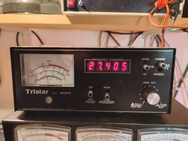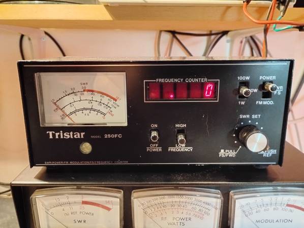 Ham/CB SWR Power and Frequency counter combination meter. Also has field strength and FM modulation. Requires 12VDC to operate. 1/10/100W power range
