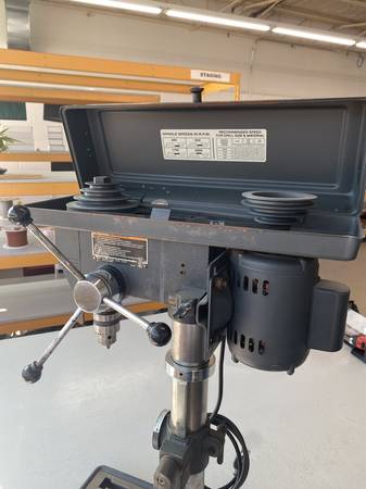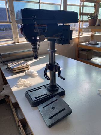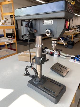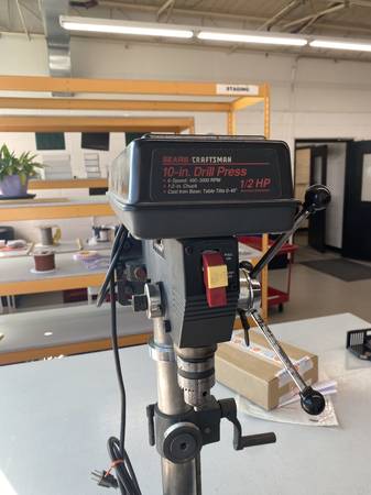 The Craftsman 10 Inch Drill Press is a high-quality power tool designed for precision drilling tasks. Made in the United States with durable materials, this corded electric drill press features a 1/2 inch chuck size and a powerful 720W motor, 1/2 HP. With an adjustable speed range of 620 RPM to 3100 RPM, it offers versatility for various drilling projects. The set includes a sturdy stand for stability during use, making it a reliable and heavy-duty option for any home workshop or professional setting. The work support table needs to be tapped and reattached to the unit. It stripped from use.