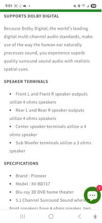 5.1 Channel Surround Sound where two front speakers have 4 ohms speaker, two surround speaker has 4 ohms rating, the center speaker has 4 ohms rating and the subwoofer has an 3 ohms rating.