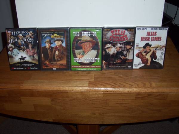 I have ONE DVD of ALIAS JESSE JAMES,staring Bob Hope & Rhonda Fleming. I also have 15-VHS Western Movies. I also have 5-DVD set of Gunsmoke/ The Collector's Edition I also have 1-Vhs Movies of TV Classics With the Cisco Kid & The Roy Rogers Show, also 3-VHS Movies of Star-Studded Westerns. See Pictures. Buyer will have to pay for shipping. ONLY THIS WEEK ONLY BEST OFFER