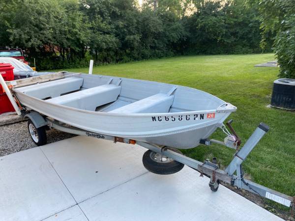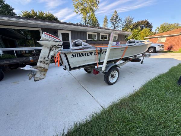 1993 smoker craft 14 foot row boat. All rivets sealed and does not leak. Comes as shown with, anchor, old oars, 2 fold down swivel seats and a Johnson seahorse 15 hp outboard. Motor runs and shifts to reverse fine but does not have working fuel line and fuel tank. We have titles for boat and trailer. NO TRADES. Will not separate this and price is firm at $2350. Please email or contact at 248-6seven7-1zero8 seven.