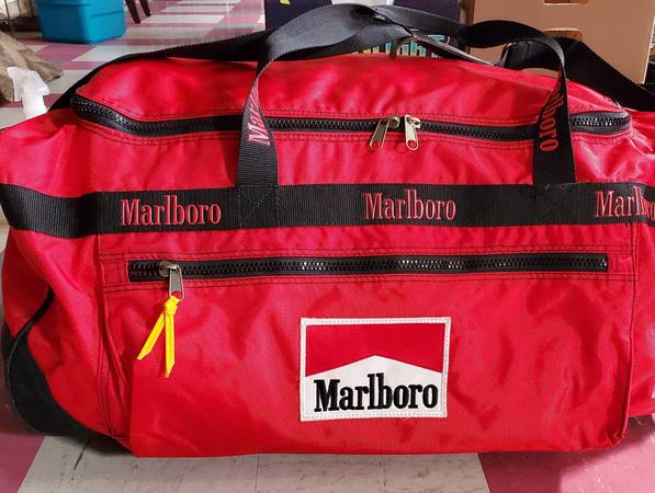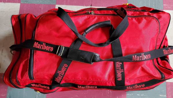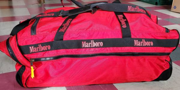 Collectable Vintage Classic Marlboro Red Bag With Wheels and Marlboro Flask. In great condition, very clean. See photos for details. Measures: 21"L x 11"W X 13"H. Never used, stored well and no...