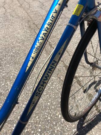 Original owner of this classic 1980 Schwinn Deluxe Varsity bike. "At the time the amazingly easy, positive shifting set the new Schwinn Deluxe Varsity apart from other 10-speed bikes. Designed with the 470-9 20" frame it's equipped with a front freewheeling FF system and a Positron stem-mounted shift lever which moves each gear with a positive click-an unbeatable combination for riders new to 10-speed machines and a real convenience for experienced riders. Schwinn Breeze Sports Touring 27 x 1 1/4" gumwall tires make this sturdy 37-pound 10-speed a joy to ride and easy to maintain." This bike is heavy duty and in great condition for it's age. Brake cables, pads, tires, and other original components could or may use an upgrade/replacement. Excellent addition for the collector or a great bike to get around.