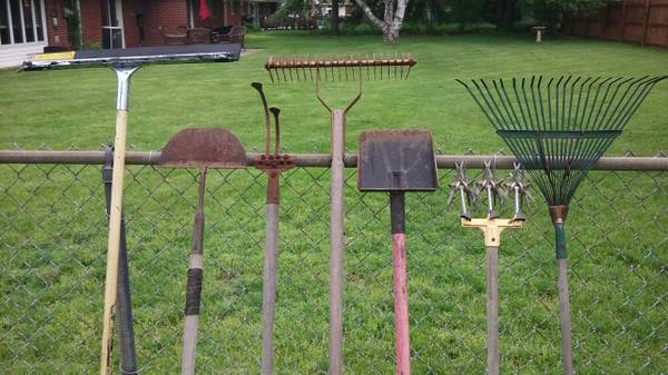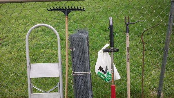 Aluminum gutter guards 3 ft. sections, Golf hole markers, 5 gal. used buckets, garden hose holder, new grass clippers , tree hand saw, heavy duty gate 32 inch wide x 46 inch tall w/post clamps, electric hedge trimmer -$20 hedge shears-$15,new metal buckets n more . Various Prices on Items listed. Cash Only