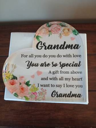 Unfortunately didn't have a chance to give them to Grandma. Pictured are Sacredyna Angel, glass 5" tall 3" wide at widest point $15. Lucite Grandma Heart $10, Pink Glass cross $" tall with saying $15, Light up Rose in glass Cloche and gift box $20, Statue made of resin by Susan Lordi, Close to me saying. Hand painted 8" tall. All items in boxes for gifting except Lucite heart is in bubble wrap.
