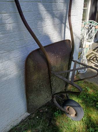 Steel wheelbarrow has solid rubber tire. From the early 1940's $75. Cash only upon pick up
