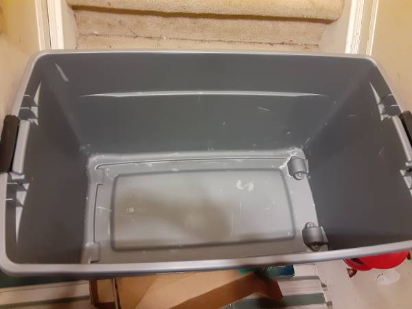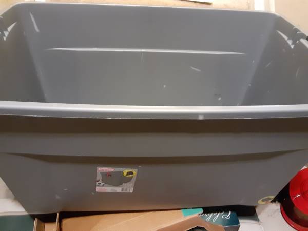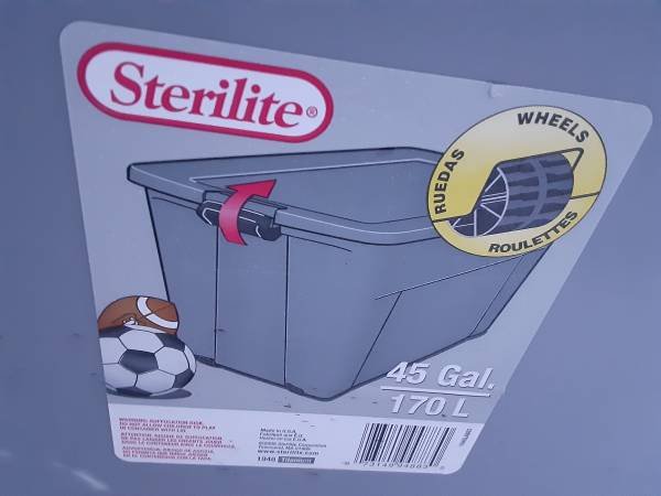 • For sale Garage box,Sterilite 45 Gallon Wheeled box,storage box. • Light grey box – no lid. $8.00 IF NEED BOX LID - BOX and LID , $13.00 • Box measures about 33” long x about 20 ½” wide x about...