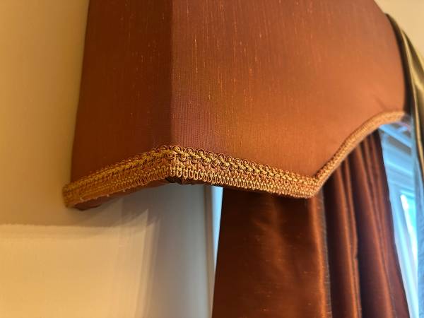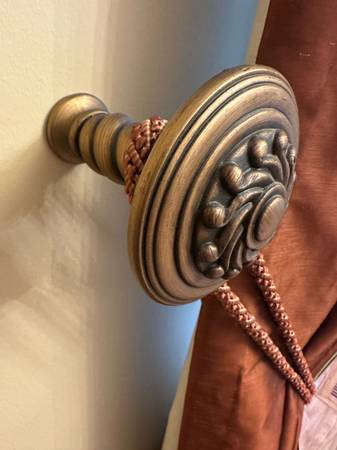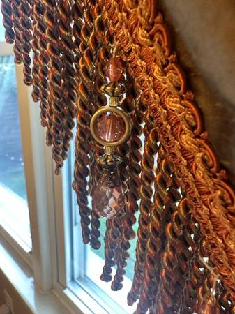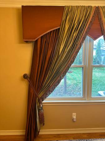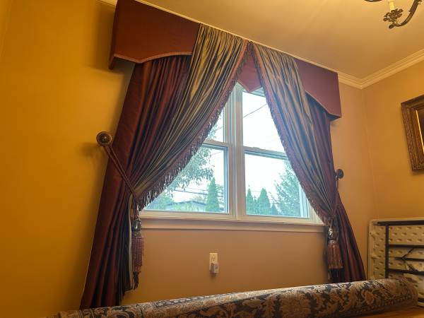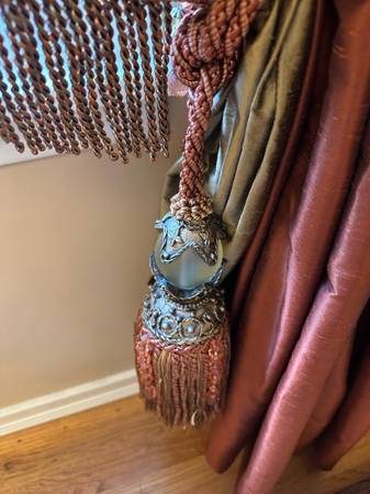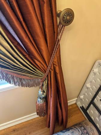 Yellow Gold draperies are true silk fabric, while red / maroon / burgandy draperies are polyester for a silk blend fabric. Includes antique inspired holdbacks and tie backs with stunning crystal & metallic tassels to vividly express royal detail. Includes all mounting hardware to easily reinstall — Ready to refresh your home windows in true luxury. From a clean, smoke free & pet free household.