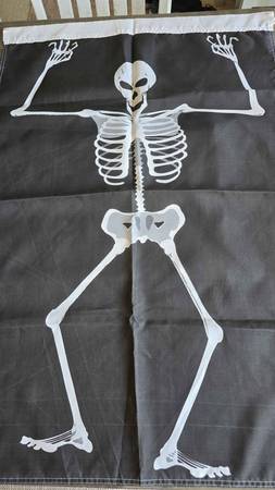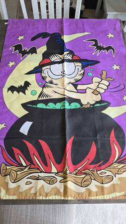 Skeleton outdoor flag 27"x41" - $3 Garfield outdoor flag 29"x41" - $3 **Flags can be used indoors or outdoors Welcome Home Pumpkin sign - $10 Candle Holder w/orange candle - $8 "Happy Halloween"...