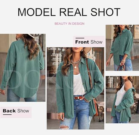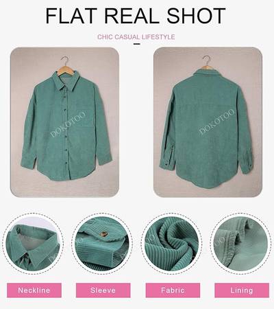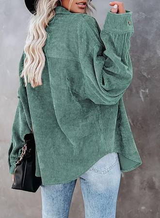 Feature: Corduroy Fabrication, Solid Color, Front Button Closures, Bust Pocket, Long Sleeves with Button Cuffs, Boyfriend Style, Turn-Down Collar, Loose Fit Shirts. It can be tied at the waist or wrapped around waist, wear as 3/4 sleeves or full sleeve.