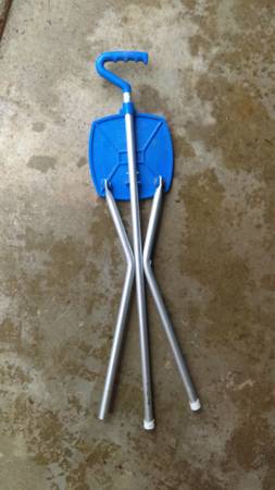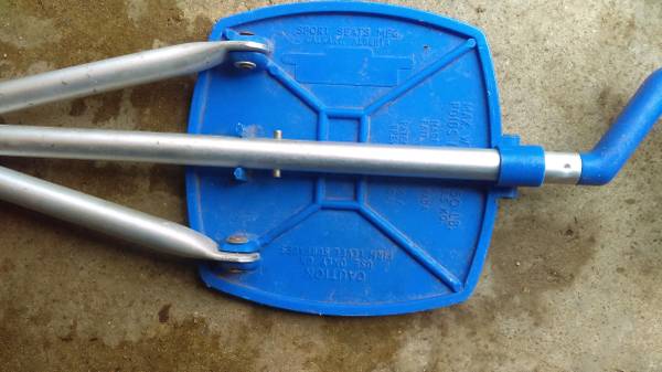 Sport Seat, blue plastic Dimensions: seat size: 7 ¾” x 7 ¾”, seat height: 21”, overall depth: 9” Dimensions: closed – 9 ¾”w x 34 ¼”h x 1 3/8”d Max weight: 250 lbs Sports Seat Mfg., Calgary Alberta...