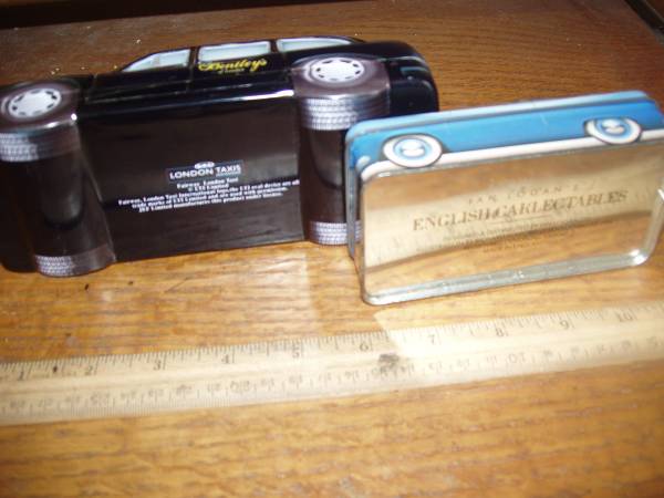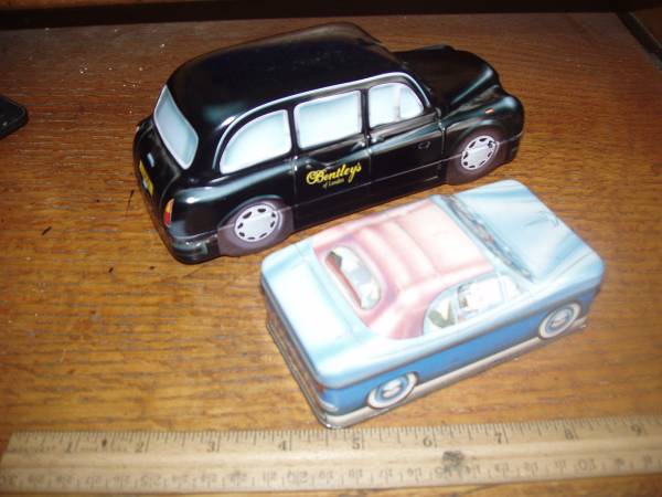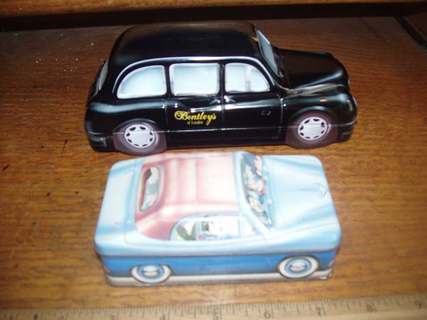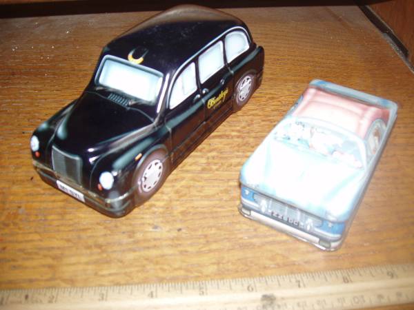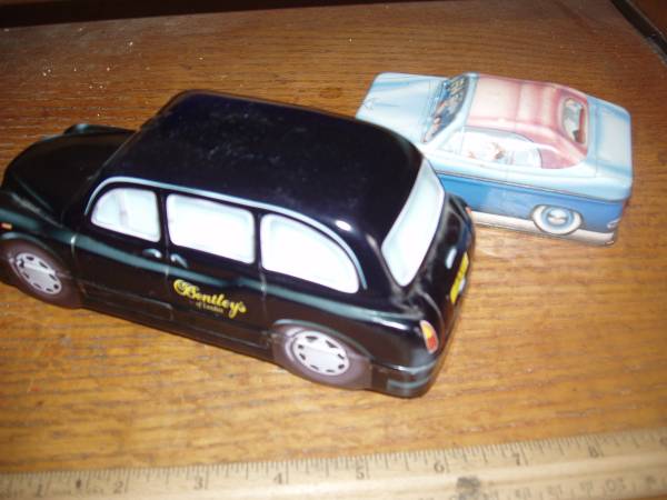 ---24 EIGHT 31 FIVE 3815------2 ENGLISH BRITISH CAR AUTO TAXI -FX4--CONVERTIBLE TINs-5 " & 8"---convertible(looks like a FORD) labeled on bottom---IAN LOGAN's CARLECTABLES-MADE in ENGLAND-1984---the TAXI- FX4 London taxi- labeled BENTLEY's of LONDON on doors---labeled on bottom-LONDON TAXIS--FAIRWAY LONDON TAXI-JEF LIMITED-$2 EACH