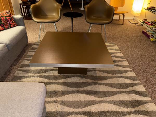 Beautiful MCM 1970’s cocktail table 36” square 15” height Brown pebble top finish excellent Brown pebble base finish excellent 2” brushed aluminum trim (perfect) Milo Baughman style SCAMMERS DONT...