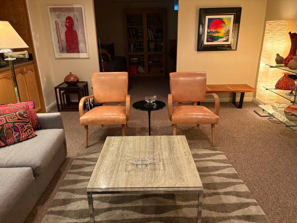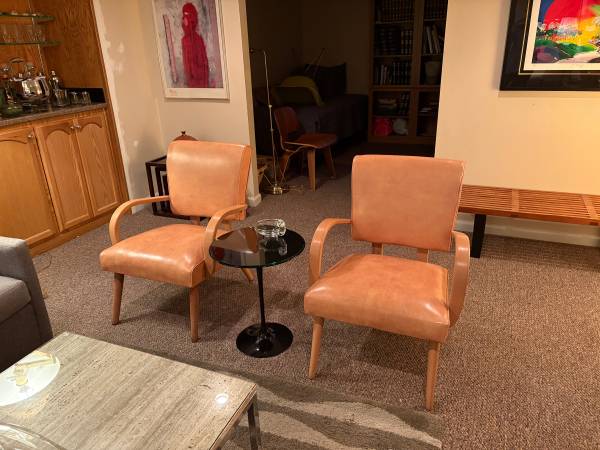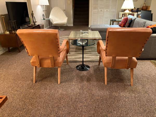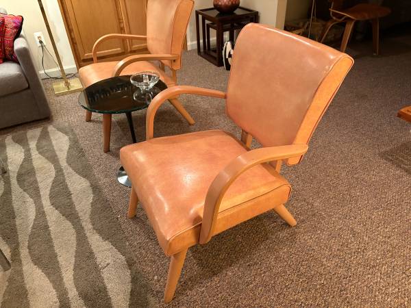 Stunning pair of Viking Artline chairs 1950’s vintage Naugahyde No rips, cuts , damage Virtually flawless Brown Naugahyde finish Wood light oak Price is for the pair Collector condition NO SCAMMERS