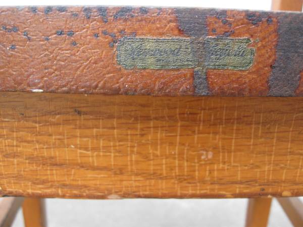 This oak chair is by Heywood Wakefield. (There is a photo of the decal, but it is pretty rough.)