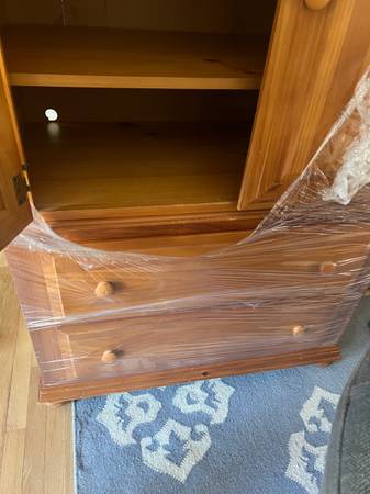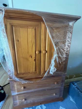 Bassett Wood Wardrobe / Chest - $150 Doors open with 3 deep shelves and 2 large drawers 5 feet 2.5 inches tall 3 feet 2 inches wide (Wrapped because we thought we could move it)