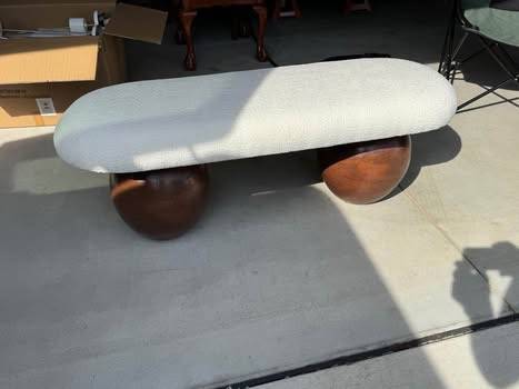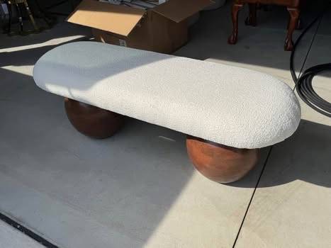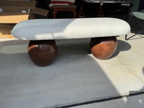 New Sleek Classy design Beautiful accent bench mid century styling. The long, oval-shaped Fissio Bench is upholstered in a white fabric and is comfortably stylish. The Fissio Bench has two, ball-shaped legs for a sensuous look.