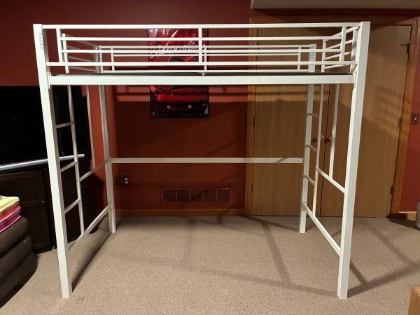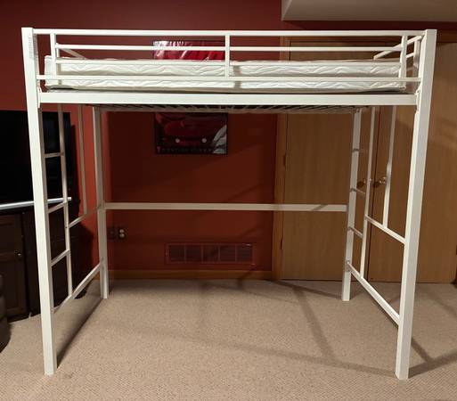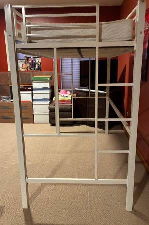 This listing is for a steel loft with the "bunkie boards" and a twin mattress. The loft is in great condition. It was originally purchased in August of 2023 and is like new. It has room for another...