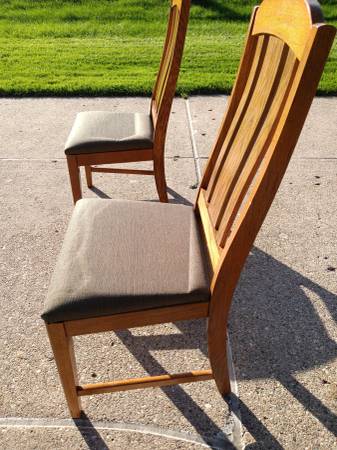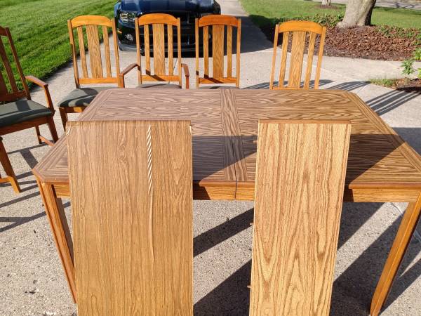 Wood dining room set including table, six chairs, and china cabinet for sale. Table has two leafs, one original matching in the set and another home made for added length and seating (the home made leaf is for use under table cloth only). The china cabinet is two pieces (upper and lower removable for transit) and has a single shelf behind the lower wood doors and two shelves in the upper glass portion. The upper portion also contains a showcase light. The lower portion can be used on its own as a buffet. Chairs are recently re-upholstered. Everything is in good working order. Please message with any questions.
