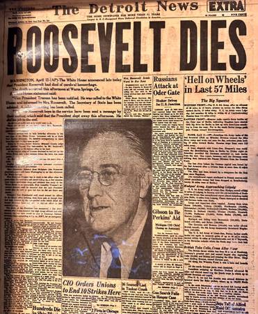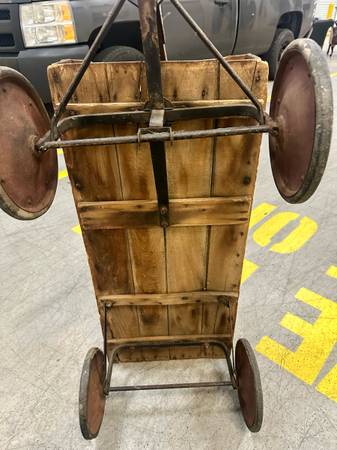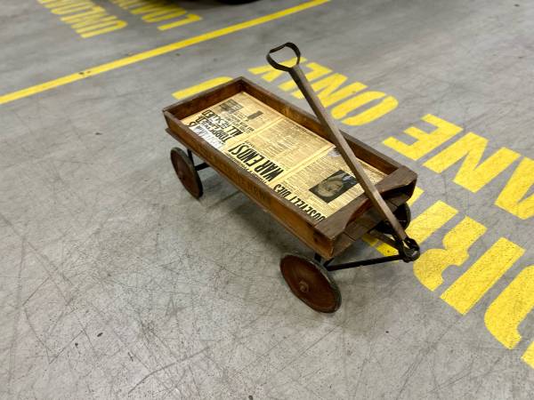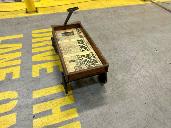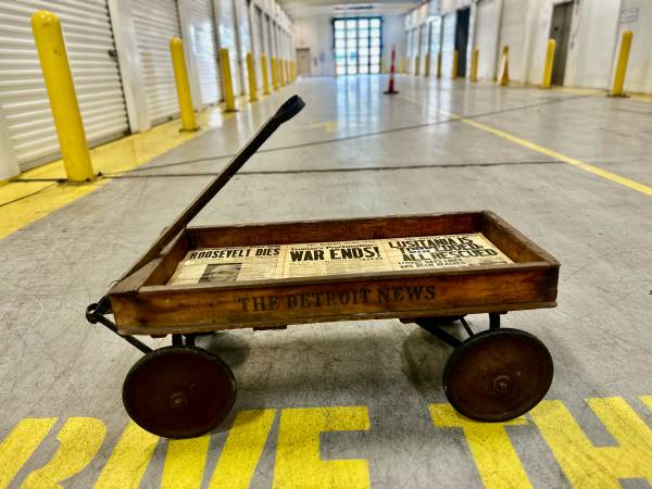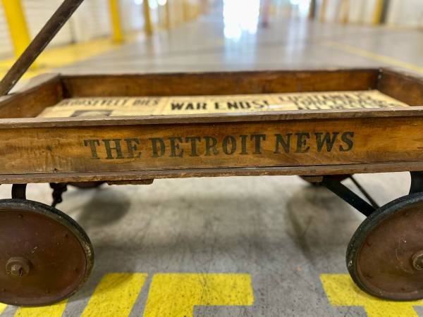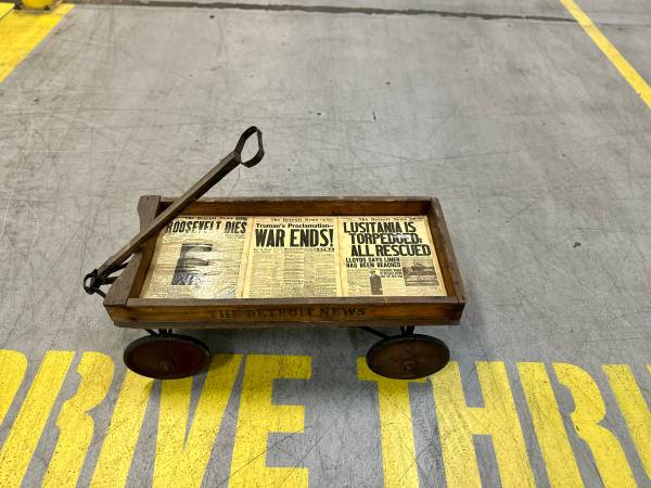 Here we have a pre-WWII Detroit News wagon in wood with metal running gear. Inside has decoupage headline pages from actual Detroit News issues. Condition: wood/wagon/gear/wheels very good. Item is...