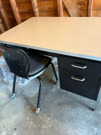 Office desk metal with 3 drawers ($500) -rollable office chair ($100)- and wooden office chair ($150) or best offer