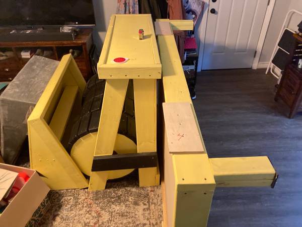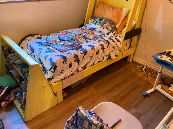 This is a kids bed in the shape of a bulldozer. Made from wood, mostly 2x4’s & 2x6’s by my dad for my son. The “TOBY” has been removed; needs something in its place. It fits a full mattress. It has a bookshelf on the end in the shape of the bulldozer blade, and a shelf on top. There were reflectors stuck on top that have fallen off, but can easily be replaced with whatever you want. The wheels are not structural; there is a post behind them that holds up the bed. Comes with all the screws to put it back together. You will need to come get it. You will need a pickup or van or trailer.