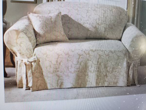 SURE-FIT SOFA COVER - 84 INCH. TAUPE/BEIGE SWIRL PATTERN. HEAVYWEIGHT COTTON. NEW. $44. PRICED AT LESS THAN 1/3 OF RETAIL. (The 1st picture is the actual pattern; the 2nd picture is to show the...