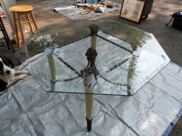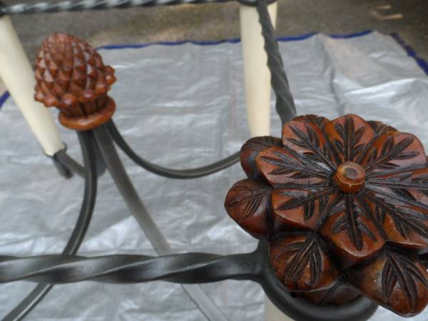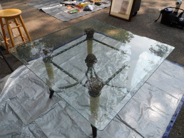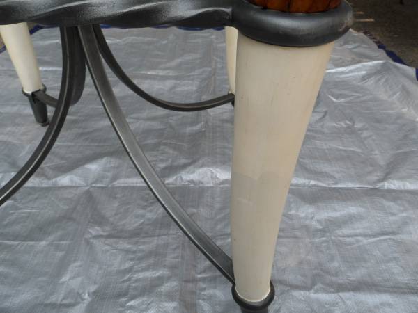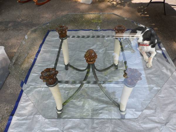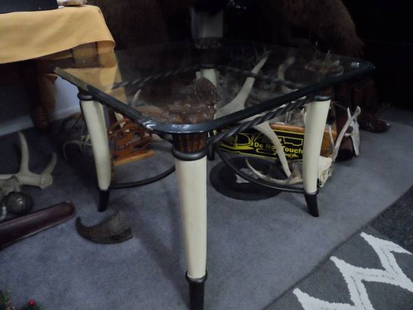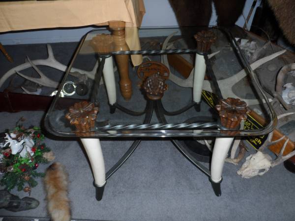 2 FAUX ELEPHANT TUSK END TABLES WILL SEPERATE TWISTED WROUGHT IRON CONSTRUCTION 24" TALL HEAVY GLASS TOPS, CHOICE OF 30"X 30", 38"X 38", OR 43" OCTOGAN SHAPE 1970'S CONTEMPORY