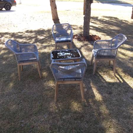 Complete with 4-chairs and a table to provide a cozy place to sit and a handy place to serve snacks and drinks while you enjoy the cool spring days, warm summer months and crisp fall evenings.