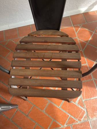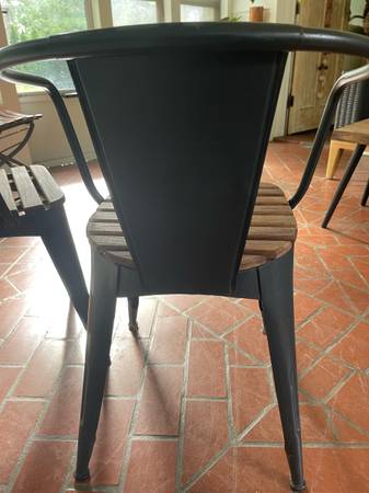 Up for sale are 2 farm style chairs from Pottery barn in great condition. Slats are teak wood. Black rubbed metal frame. Used very little. Originally bought for $275each. Asking $100 each. Happy to answer any questions. Measures- 30” high. Arm to arm 21” and seat is 16x 16” approximately. If interested call show contact info